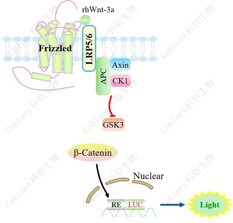 Wnt Effector Reporter Cell 報(bào)告基因藥靶模型很好的模擬了體內(nèi) WNT 的信號(hào)轉(zhuǎn)導(dǎo)過(guò)程,原理見下圖所示。