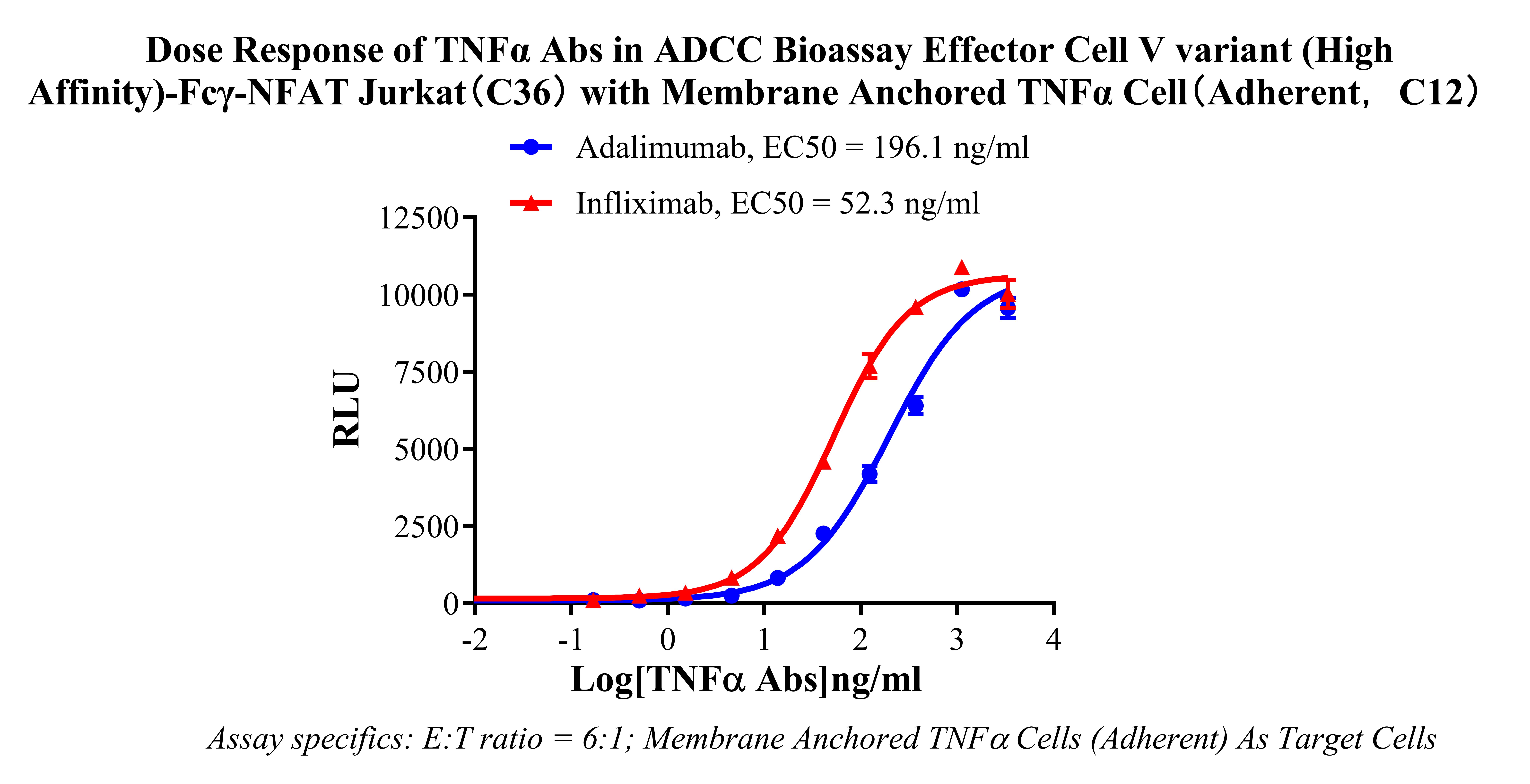 Figure 2. Dose Response of TNFα Abs in ADCC Bioassay Effector Cell V variant (High Affinity)-Fcγ-NFAT-Jurkat (C36) with Membrane Anchored TNFα Cell (Adherent, C12).