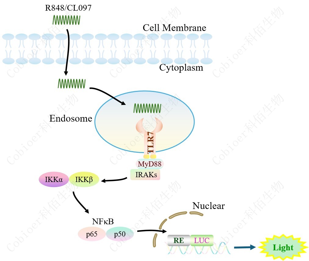 TLR7 NFκB-Luc HEK293 報告基因藥靶模型很好的模擬了體內(nèi) TLR7 的信號轉(zhuǎn)導過程, 原理見下圖所示。