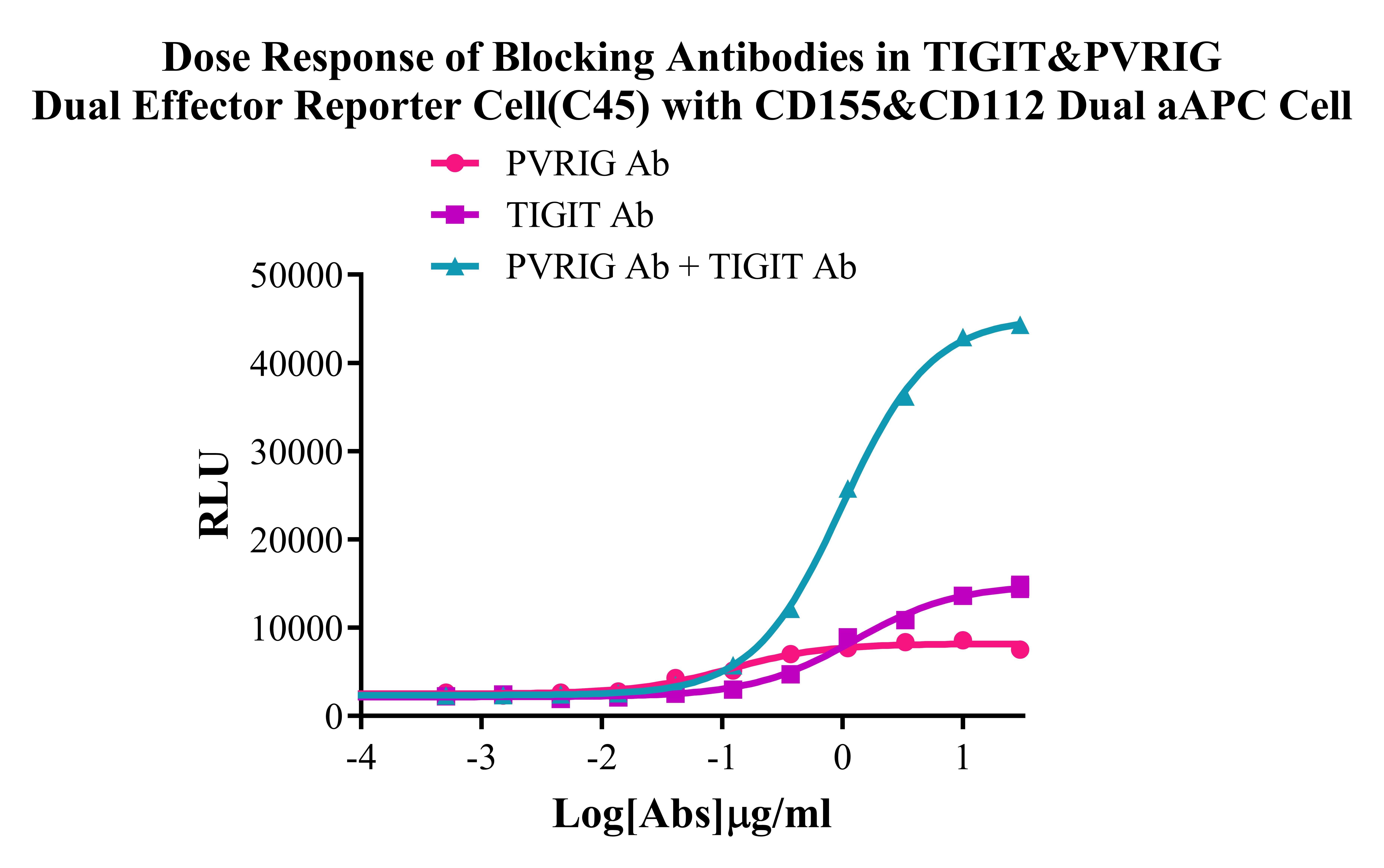 Figure 3. Dose Response of Blocking Antibodies in TIGIT/PVRIG Dual Effector Reporter Cell(C45) with CD112/CD155 Dual aAPC Cell.