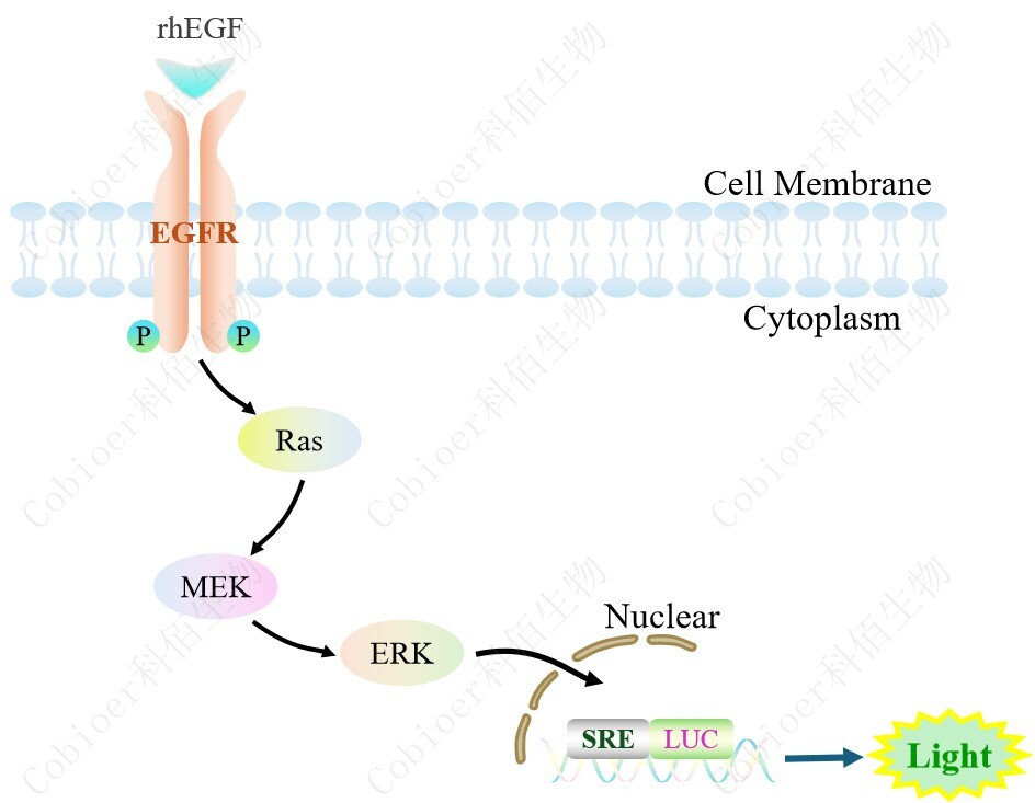 SRE-Luc HEK293 報告基因細(xì)胞是由 SRE 調(diào)控并表達 Luc 熒光素酶報 告基因的 HEK293 細(xì)胞。EGF 與受體結(jié)合,激活 SRE 的原理見下圖所示。![]() Figure 1. SRE-Luc HEK293 細(xì)胞模型原理圖
