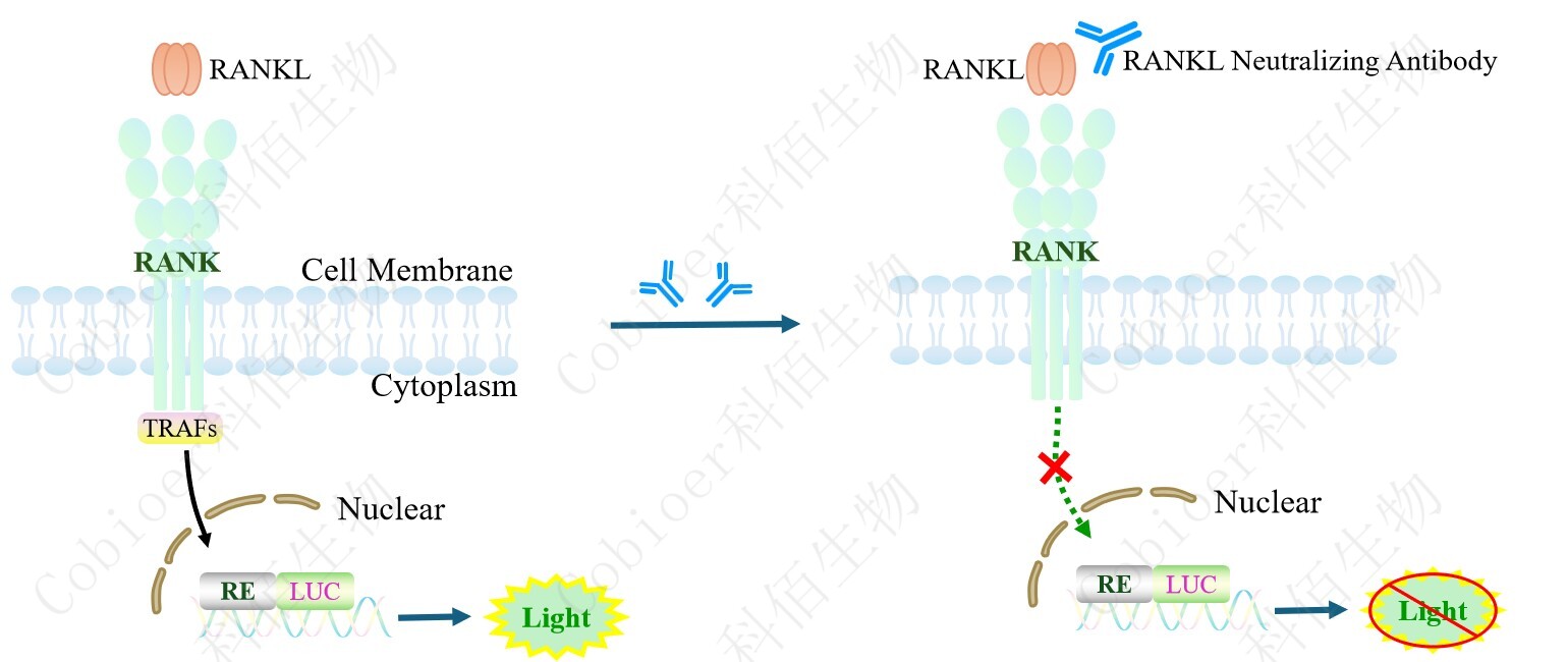 RANK Effector Reporter Cell 報(bào)告基因藥靶模型很好的模擬了體內(nèi) RANK 的信號(hào)轉(zhuǎn)導(dǎo)過程,原理見下圖所示。![]() Figure 1. RANK Effector Reporter Cell 細(xì)胞模型原理圖 |