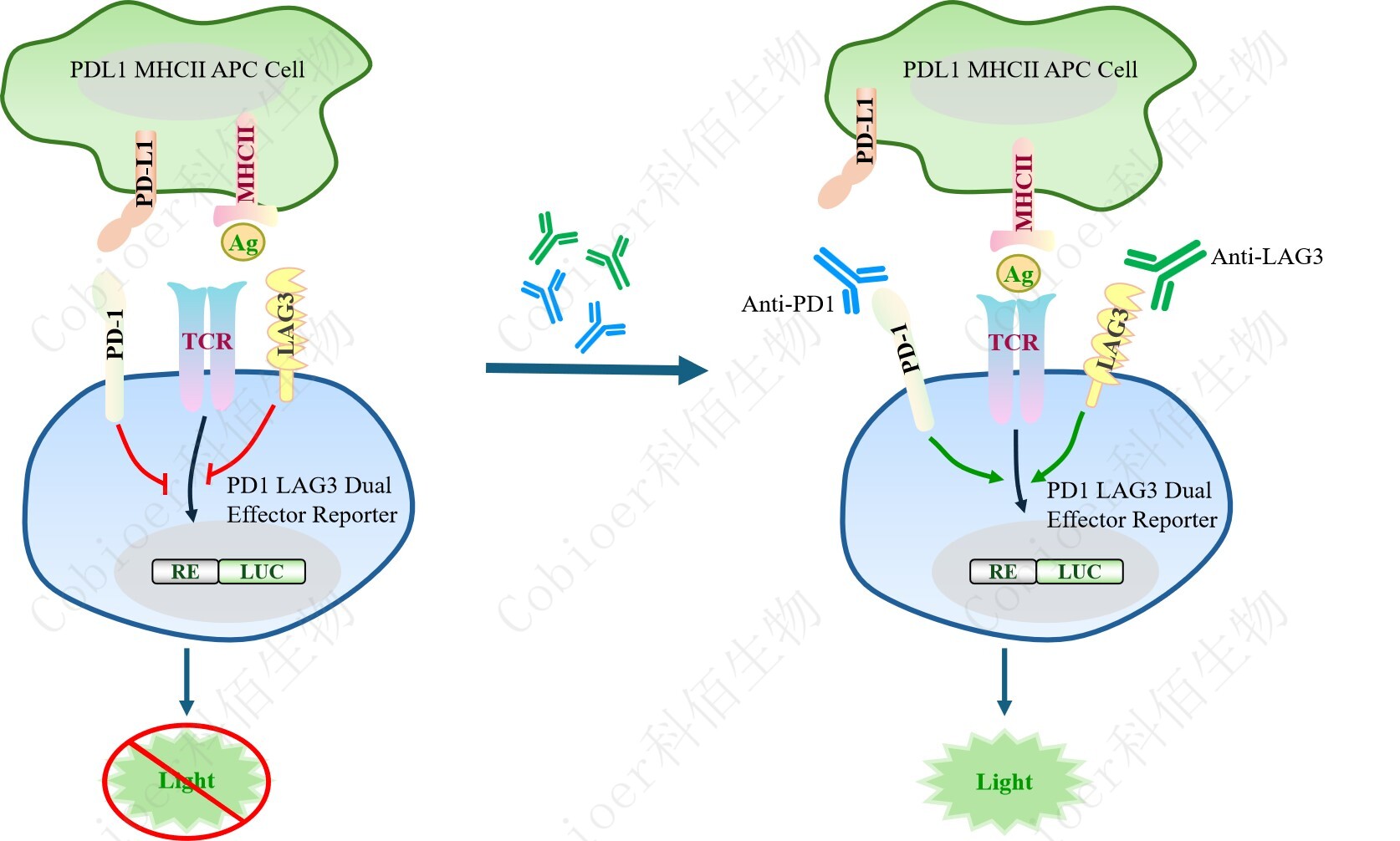 PD1 LAG3 Dual Effector Reporter Cell 報告基因藥靶模型很好的模擬了體內 PD1&LAG3 的信號轉導過程,原理見下圖所示。![]() Figure 1. PD1 LAG3 Dual Effector Reporter Cell 細胞模型原理圖 |