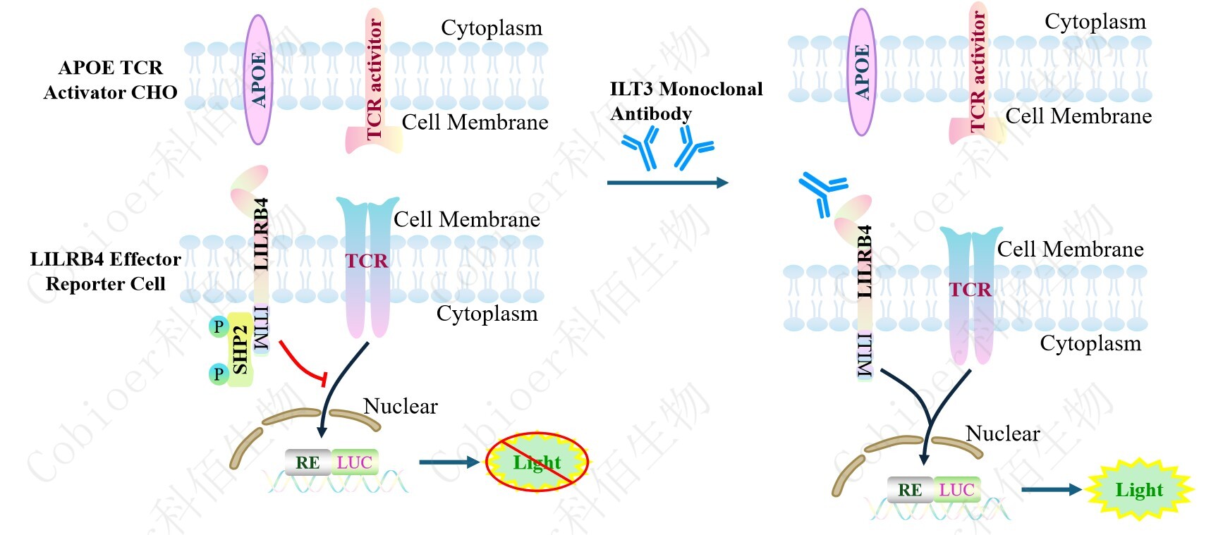 APOE TCR Activator CHO 作為 LILRB4 Effector Reporter Cell 的靶細胞,很好的模擬了 體內(nèi) LILRB4 的信號轉(zhuǎn)導(dǎo)過程,原理見下圖所示。![]() Figure 1. APOE TCR Activator CHO 模型原理圖 |