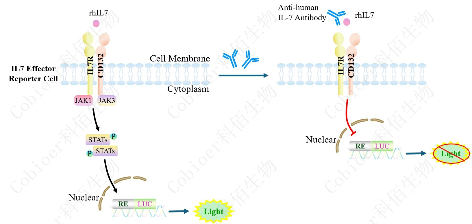IL7 Effector Reporter Cell 報告基因藥靶模型很好的模擬了體內(nèi) IL7 的信號轉(zhuǎn)導(dǎo)過程,原理見下圖所示。![]() Figure 1. IL7 Effector Reporter Cell 模型原理圖 |