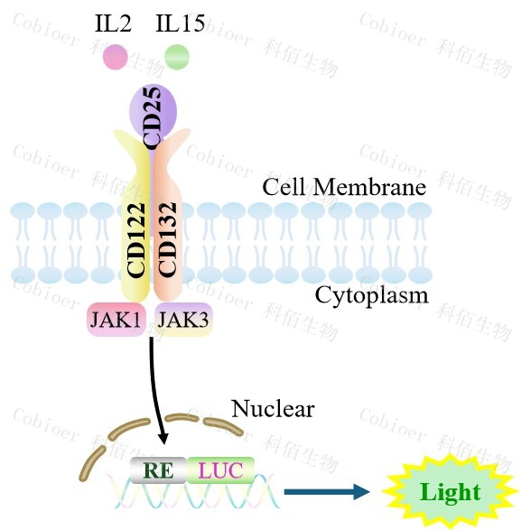 hIL2/IL15(hCD25 hCD122 hCD132)Effector Reporter Cell 報(bào)告基因藥靶模型很好的模擬了體內(nèi) IL2 受體三亞基的信號(hào)轉(zhuǎn)導(dǎo)過程,原理見下圖所示。