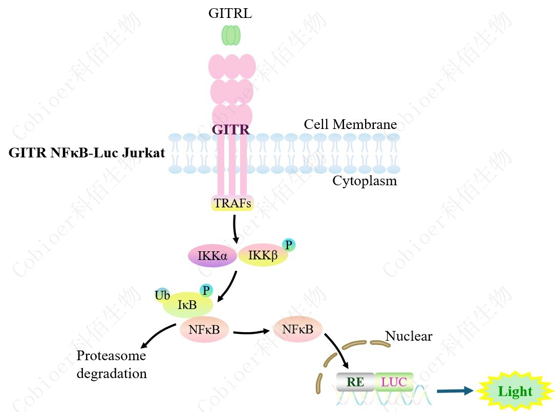 GITR NFκB-Luc Jurkat 報(bào)告基因藥靶模型很好的模擬了體內(nèi) GITR 的信號(hào)轉(zhuǎn)導(dǎo)過程, 原理見下圖所示。![]() Figure 1. GITR NFκB-Luc Jurkat 細(xì)胞模型原理圖