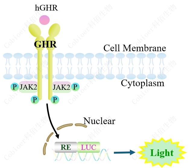 GHR Effector Reporter Cell 報告基因藥靶模型很好的模擬了體內(nèi) GHR 的信號轉(zhuǎn)導(dǎo)過程, 原理見下圖所示。![]() Figure 1. GHR Effector Reporter Cell 細(xì)胞模型原理圖 |