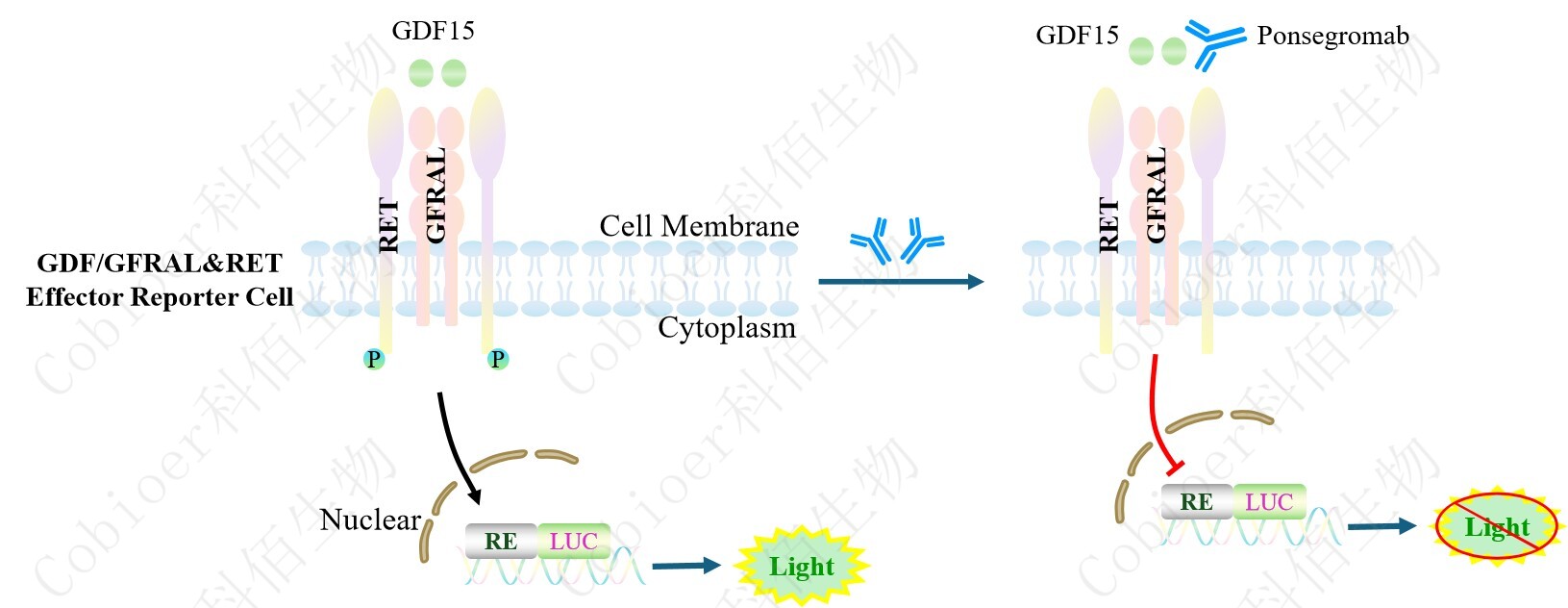 GDF/GFRAL&RET Effector Reporter Cell 報告基因藥靶模型很好的模擬了體內 GDF 的 信號轉導過程,原理見下圖所示。![]() Figure 1. GDF/GFRAL&RET Effector Reporter Cell 模型原理圖 |