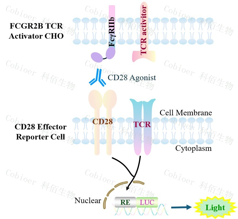 FCGR2B TCR Activator CHO,在基礎(chǔ)細(xì)胞上穩(wěn)定表達(dá) FcγRIIb 和 aAPC。 FCGR2B TCR Activator CHO 作為 CD28 Effector Reporter Cell 的靶細(xì)胞進(jìn)行功能檢測(cè),其原理圖見(jiàn)下圖所示。![]() Figure 1. FCGR2B TCR Activator CHO 的原理圖 |