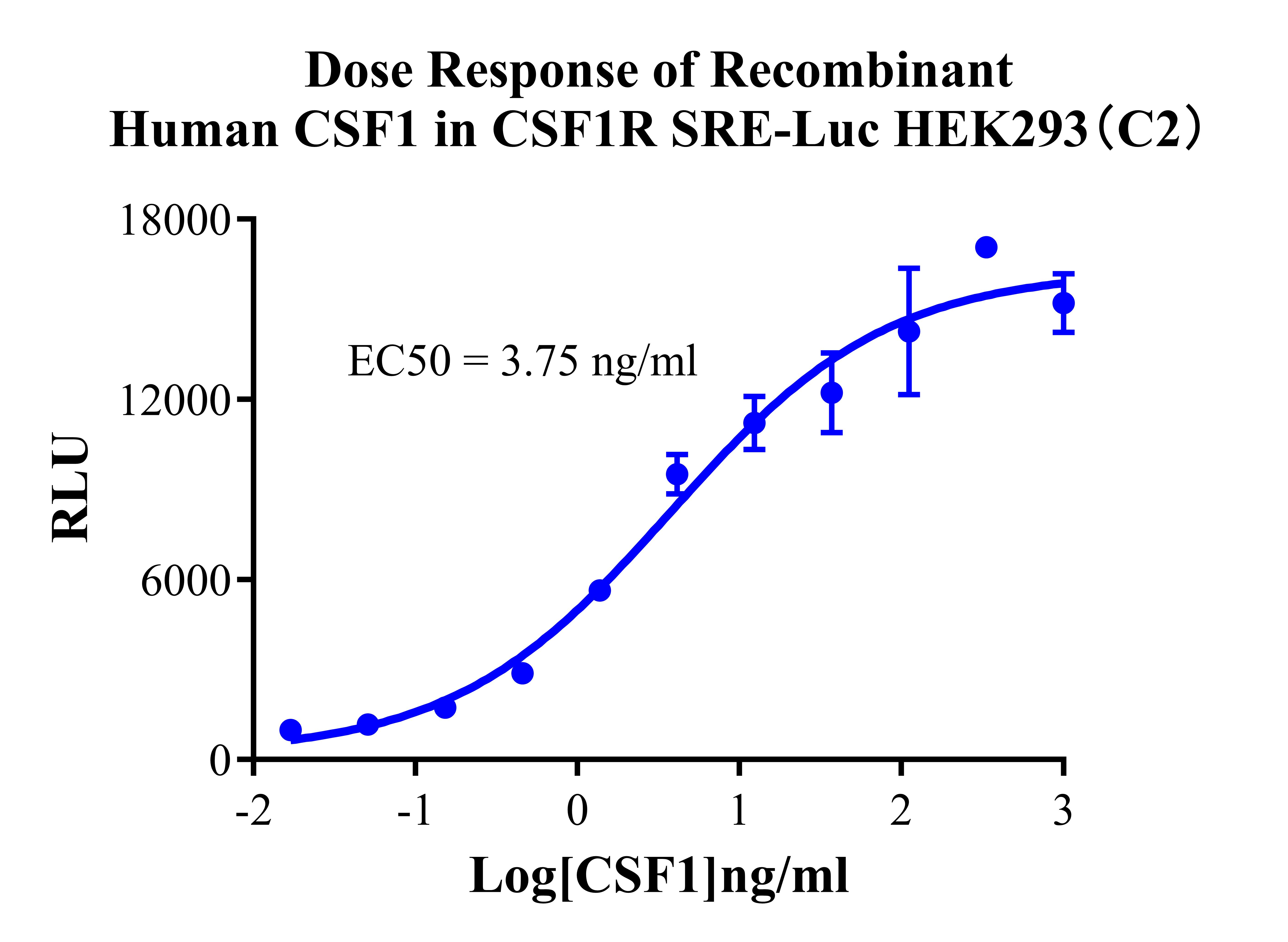 Figure 3. Detect Luciferase assay by Ultra Luciferase Detection Kit CBPH0001(we strongly suggest to purchase from Cobioer). Dose Response of Recombinant Human CSF1 in CSF1R SRE-Luc HEK293(C2).