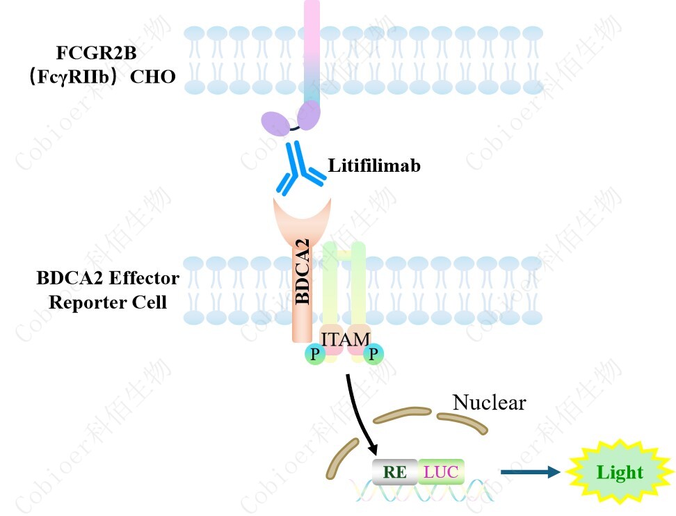BDCA2 Effector Reporter 報告基因藥靶模型很好的模擬了體內(nèi) BDCA2 的信號轉(zhuǎn)導過程, 原理見下圖 所示。![]() Figure 1. BDCA2 Effector Reporter 細胞模型原理圖
