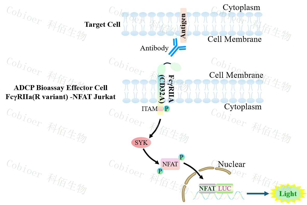 ADCP Bioassay Effector Cell FcγRIIa(R variant) -NFAT Jurkat 報告基因藥靶模型很好的 模擬了體內 ADCP 的信號轉導過程,原理見下圖所示。