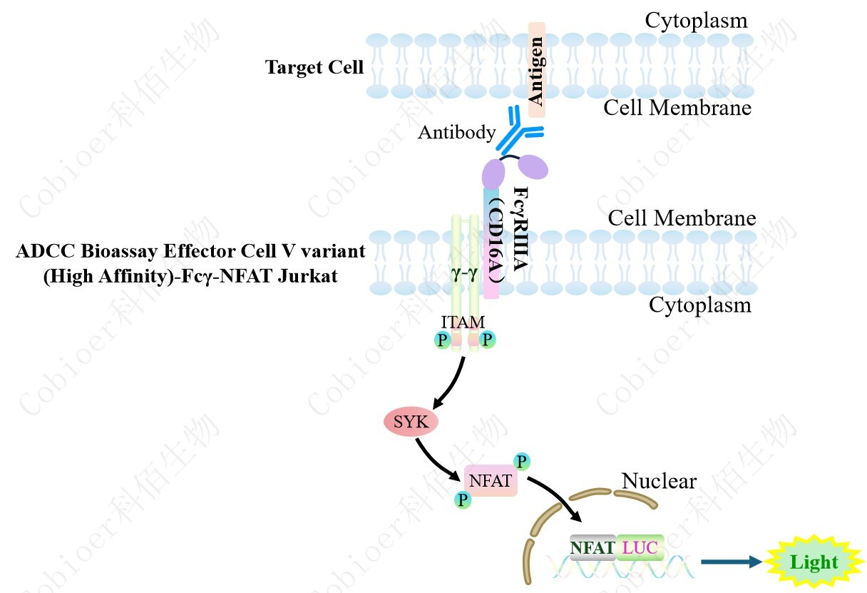 ADCC Bioassay Effector Cell V variant (High Affinity)-Fcγ-NFAT Jurkat 報告基因藥靶模 型很好的模擬了體內(nèi) ADCC 的信號轉(zhuǎn)導過程,原理見下圖所示。