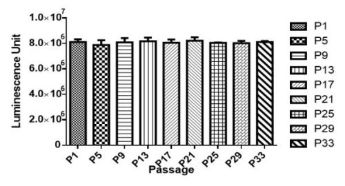 Figure. Stablity test results. NCI-H1703-Luc cells showed at least 32 passage stability with similar luminescence unit.