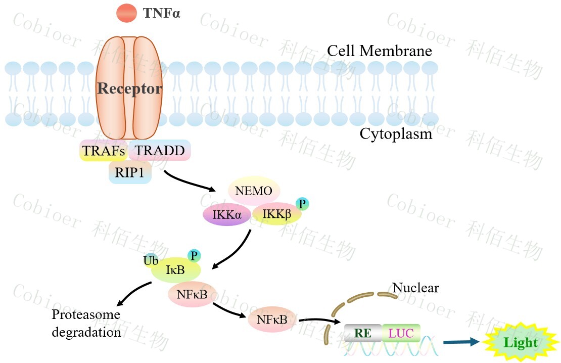 NFκB-Luc THP-1 報(bào)告基因細(xì)胞是由 NFκB 調(diào)控并表達(dá) Luc 熒光素酶報(bào) 告基因的 THP-1 細(xì)胞。TNFα 與受體結(jié)合,激活 NF-κB 的原理見(jiàn)下圖所示。
