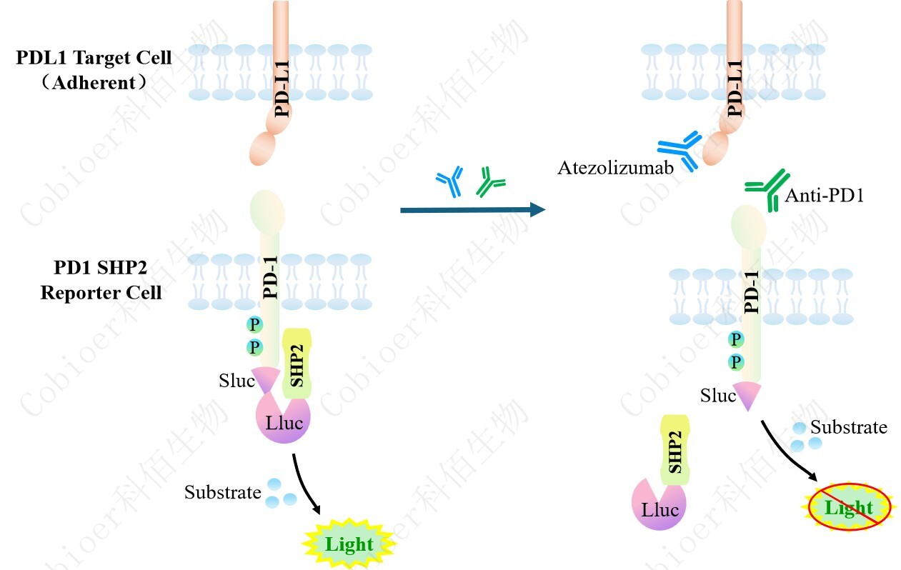 PDL1 Target Cell(Adherent)作為 PD1 SHP2 Reporter Cell 的靶細(xì)胞,藥靶模型很好的 模擬了體內(nèi) PD1&SHP2 的信號轉(zhuǎn)導(dǎo)過程,原理見下圖所示。![]() Figure 1. PDL1 Target Cell(Adherent)模型原理圖 |