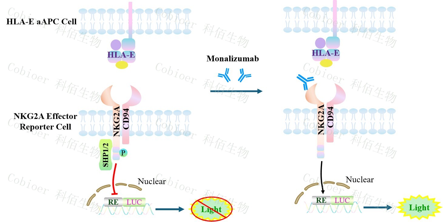 NKG2A Effector Reporter Cell 報告基因藥靶模型很好的模擬了體內 NKG2A 的信號轉導過程,原理見下圖所示。