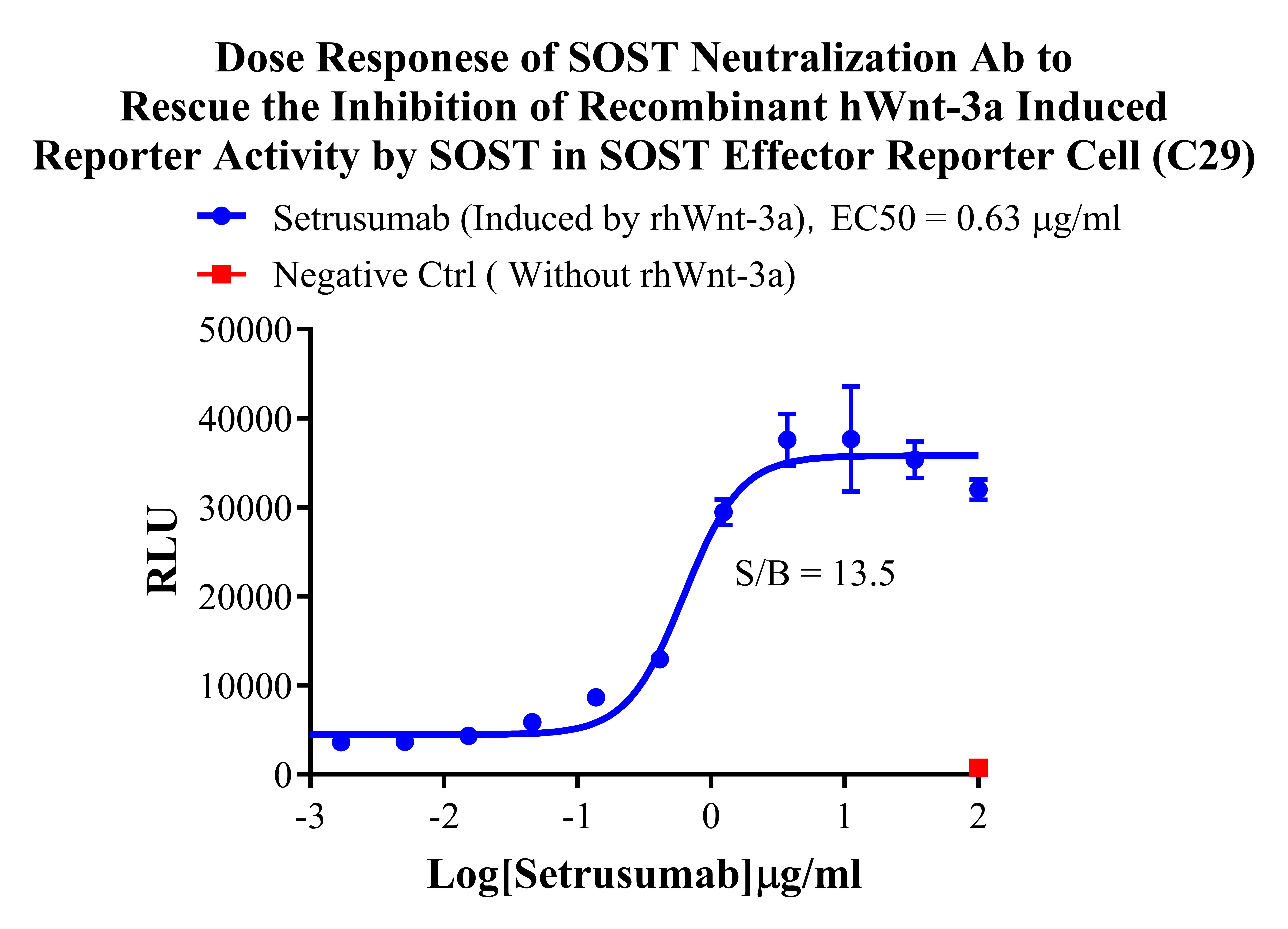 Figure 2. Dose Responese of SOST Neutralization Ab to Rescue the Inhibition of Recombinant hWnt-3a Induced Reporter Activity by SOST in SOST Effector Reporter Cell (C29). |