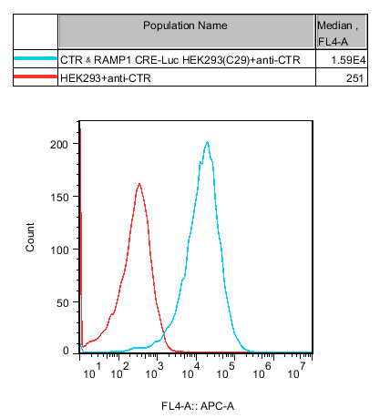 CTR&RAMP1 CRE-Luc HEK293 報(bào)告基因藥靶模型很好的模擬了體內(nèi) CTR&RAMP1 的信號(hào)轉(zhuǎn)導(dǎo)過程,原理見下圖所示。![]() Figure 1. CTR&RAMP1 CRE-Luc HEK293 細(xì)胞模型原理圖 |