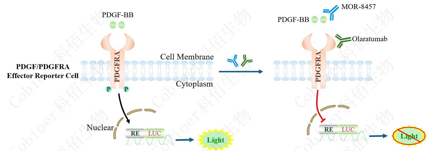 PDGF/PDGFRA Effector Reporter Cell 報告基因藥靶模型很好的模擬了體內(nèi) PDGFRA 的信號轉(zhuǎn)導過程,原理見下圖所示。
