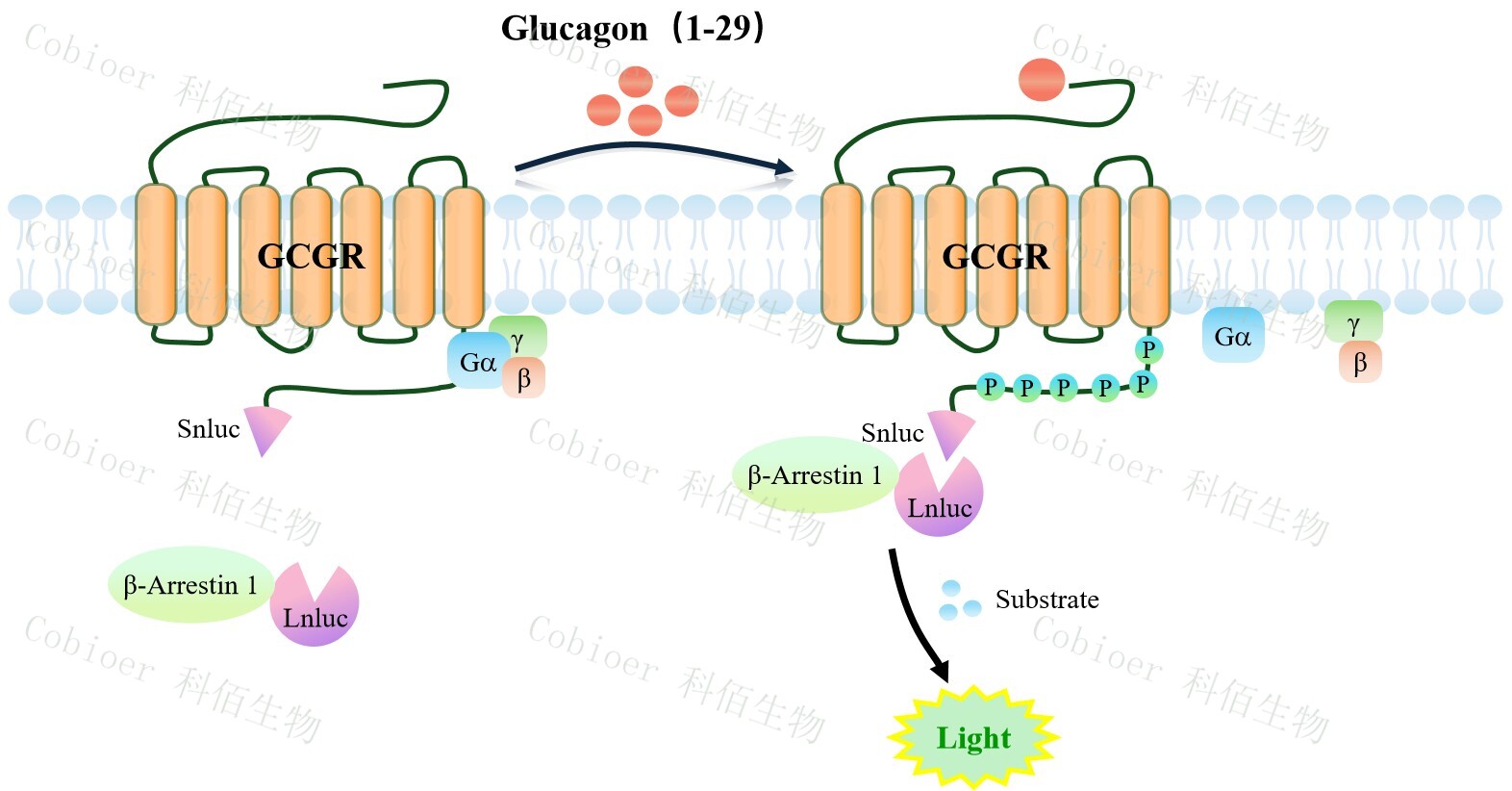 GCGR β-Arrestin 1 CHO 報告基因藥靶模型很好的模擬了體內(nèi) GCGR/β-Arrestin 1 的信 號轉(zhuǎn)導(dǎo)過程,原理見下圖所示。當(dāng)缺乏配體刺激時,β-Arrestin 1 不與 GCGR 結(jié)合,融合β- Arrestin 1 的熒光素酶處于失活構(gòu)象;當(dāng) GCGR 遭遇配體刺激時,融合熒光素酶報告基因的 β-Arrestin 1 被招募,使熒光素酶報告基因處于激活狀態(tài),加入其底物后發(fā)光信號增強。![]() Figure 1. GCGR β-Arrestin 1 CHO 細(xì)胞模型原理圖 |