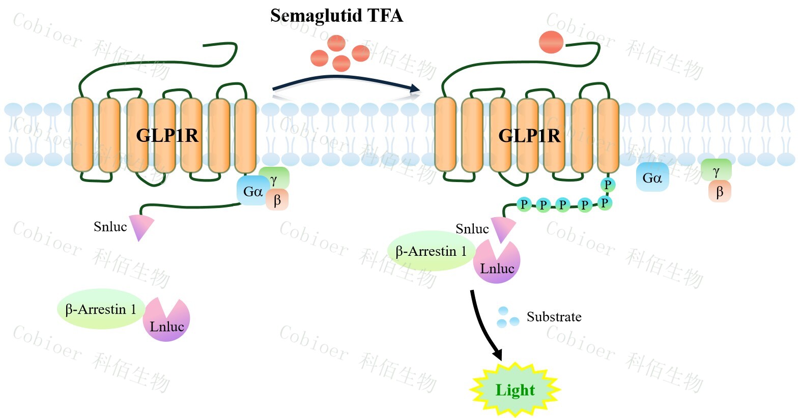 GLP1R β-Arrestin 1 CHO 報告基因藥靶模型很好的模擬了體內(nèi) GLP1R/β-Arrestin 1 的信 號轉(zhuǎn)導(dǎo)過程,原理見下圖所示。當(dāng)缺乏配體刺激時,β-Arrestin 1 不與 GLP1R 結(jié)合,融合β- Arrestin 1 的熒光素酶處于失活構(gòu)象,當(dāng) GLP1R 遭遇配體刺激時,融合熒光素酶報告基因 的β-Arrestin 1 被招募,使熒光素酶報告基因處于激活狀態(tài),加入其底物后發(fā)光信號增強。![]() Figure 1. GLP1R β-Arrestin 1 CHO 細(xì)胞模型原理圖 |