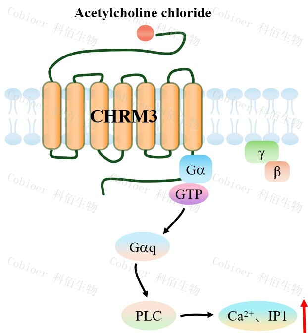 | CHRM3(Cholinergic Receptor Muscarinic 3)是毒蕈堿型乙酰膽堿受體(mAChRs)家 族的重要成員,屬于 GPCR,主要分布于外周組織(如 平滑肌、外分泌腺)及部分中樞區(qū) 域(如下丘腦),通過介導(dǎo)乙酰膽堿(ACh)信號調(diào)控平滑肌收縮、腺體分泌及能量代謝。 ACh 結(jié)合 CHRM3 后,激活 Gq/11 蛋白,啟動 PLCβ信號通路,水解 PIP2 生成 IP3 和 DAG, 觸發(fā)細(xì)胞內(nèi)鈣離子釋放,激活蛋白激酶 C(PKC);通過β-arrestin 通路調(diào)控 ERK 磷酸化, 影響細(xì)胞增殖與炎癥反應(yīng)。 | |