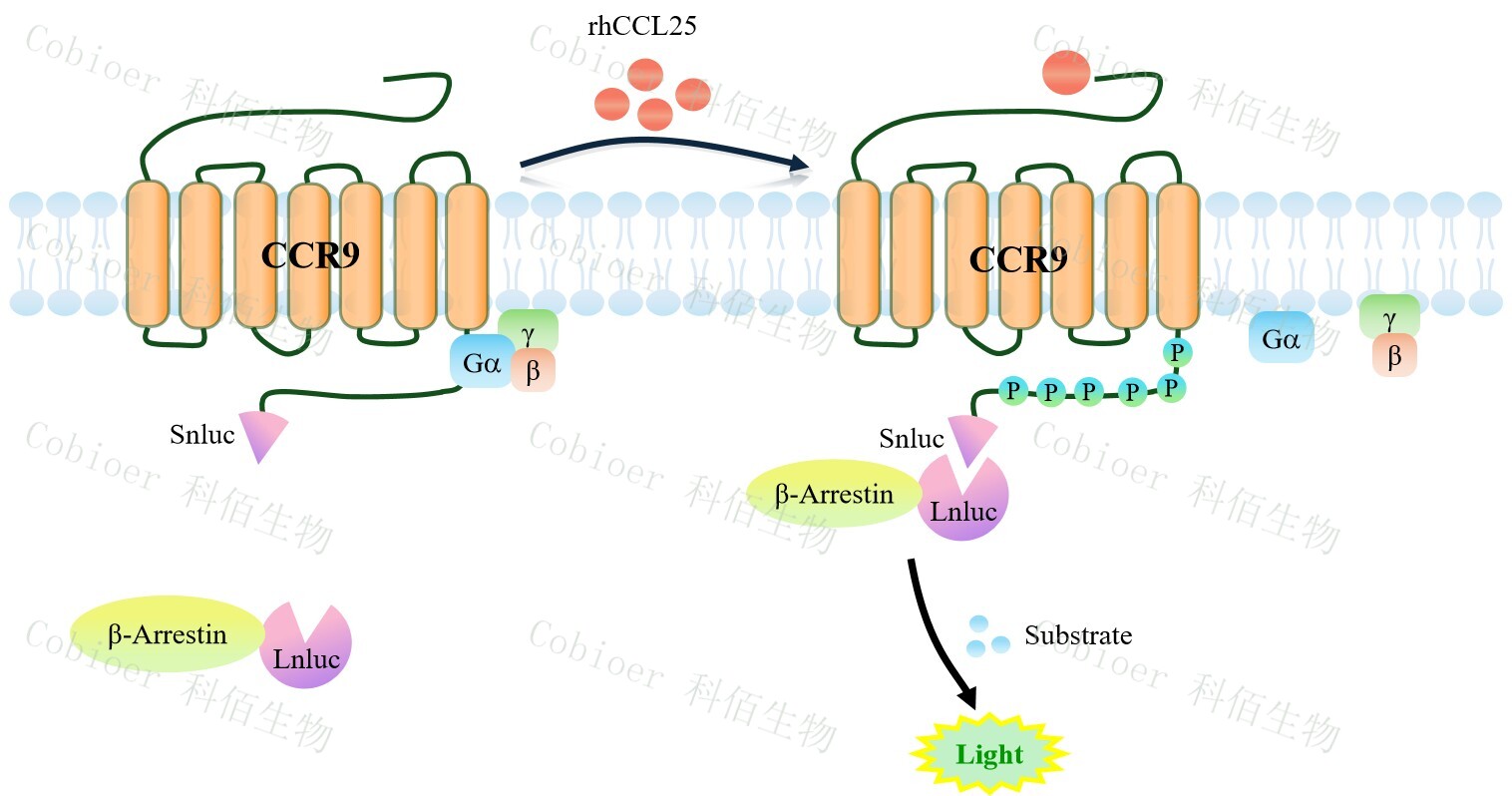 CCR9 β-Arrestin CHO 報告基因藥靶模型很好的模擬了體內 CCR9/β-Arrestin 的信號轉導過程,原理見下圖所示。當缺乏配體刺激時,β-Arrestin 不與 CCR9 結合,融合β-Arrestin 的熒光素酶處于失活構象,當 CCR9 遭遇配體刺激時,融合熒光素酶報告基因的β-Arrestin 被招募,使熒光素酶報告基因處于激活狀態(tài),加入其底物后發(fā)光信號增強。![]() Figure 1. CCR9 β-Arrestin CHO 細胞模型原理圖 |