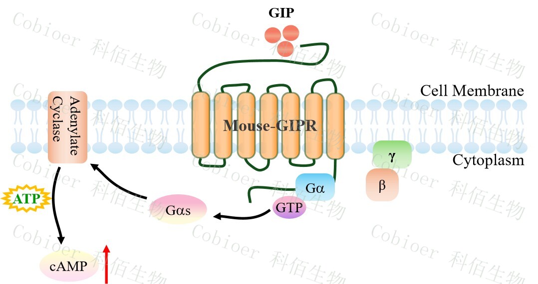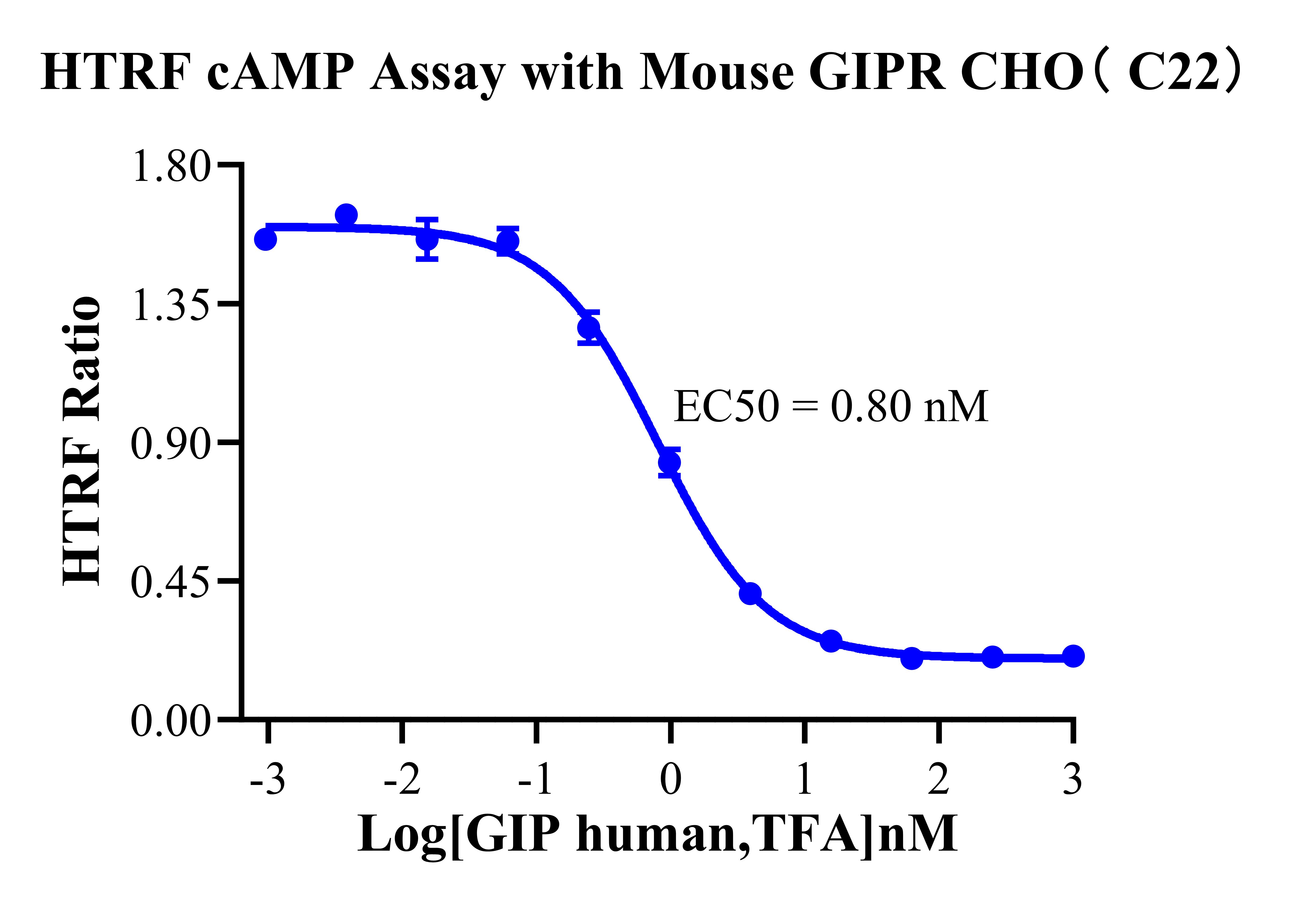 cAMP 在 G 蛋白偶聯(lián)受體(GPCR)信號(hào)轉(zhuǎn)導(dǎo)中是一種關(guān)鍵的第二信使。當(dāng)配體結(jié)合 到 GPCR,構(gòu)象發(fā)生變化,激活受體接著激活 G 蛋白,Gs 的激活導(dǎo)致腺苷酸環(huán)化酶調(diào)控 cAMP 的升高。Mouse GIPR CHO 藥靶模型很好的模擬了體內(nèi) GIPR 的信號(hào)轉(zhuǎn)導(dǎo)過程,原理 見下圖所示。![]() Figure 1. Mouse GIPR CHO 細(xì)胞模型原理圖