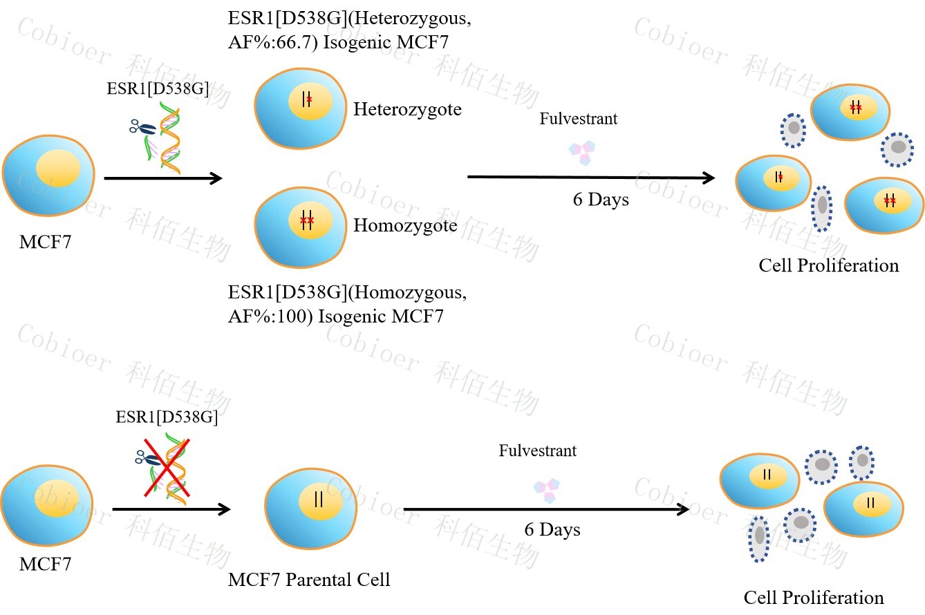 ESR1[D538G](Heterozygous,AF%66.7) Isogenic MCF7 藥靶細(xì)胞,通過基 因編輯的方式將 ESR1 的 538 位氨基酸天冬氨酸(D)突變?yōu)楦拾彼幔℅)。![]() Figure 1. ESR1[D538G](Heterozygous,AF%66.7) Isogenic MCF7 原理示意圖 |