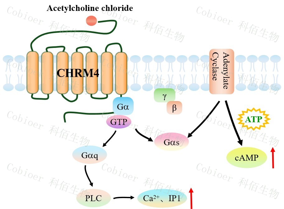 毒蕈堿乙酰膽堿受體(MAChRs,簡(jiǎn)稱(chēng) M 受體)參與中樞神經(jīng)系統(tǒng)的運(yùn)動(dòng)控制、體溫 調(diào)節(jié)、心血管調(diào)節(jié)和記憶,介導(dǎo)周?chē)窠?jīng)系統(tǒng)的平滑肌收縮、腺體分泌和心率、調(diào)節(jié)心肌 收縮力。CHRM4 作為 Gi/o 偶聯(lián)型毒蕈堿受體,中樞神經(jīng)系統(tǒng)高表達(dá),其內(nèi)源性配體乙酰 膽堿(ACh)激活后優(yōu)先通過(guò) Gi/oα亞基抑制腺苷酸環(huán)化酶,同時(shí)釋放 Gβγ二聚體。