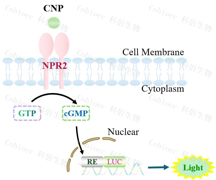 NPR2 Effector Reporter Cell 報告基因藥靶模型很好的模擬了體內(nèi) NPR2 的信號轉(zhuǎn)導(dǎo)過程,原理見下圖所示。![]() Figure 1. NPR2 Effector Reporter Cell 細胞模型原理圖