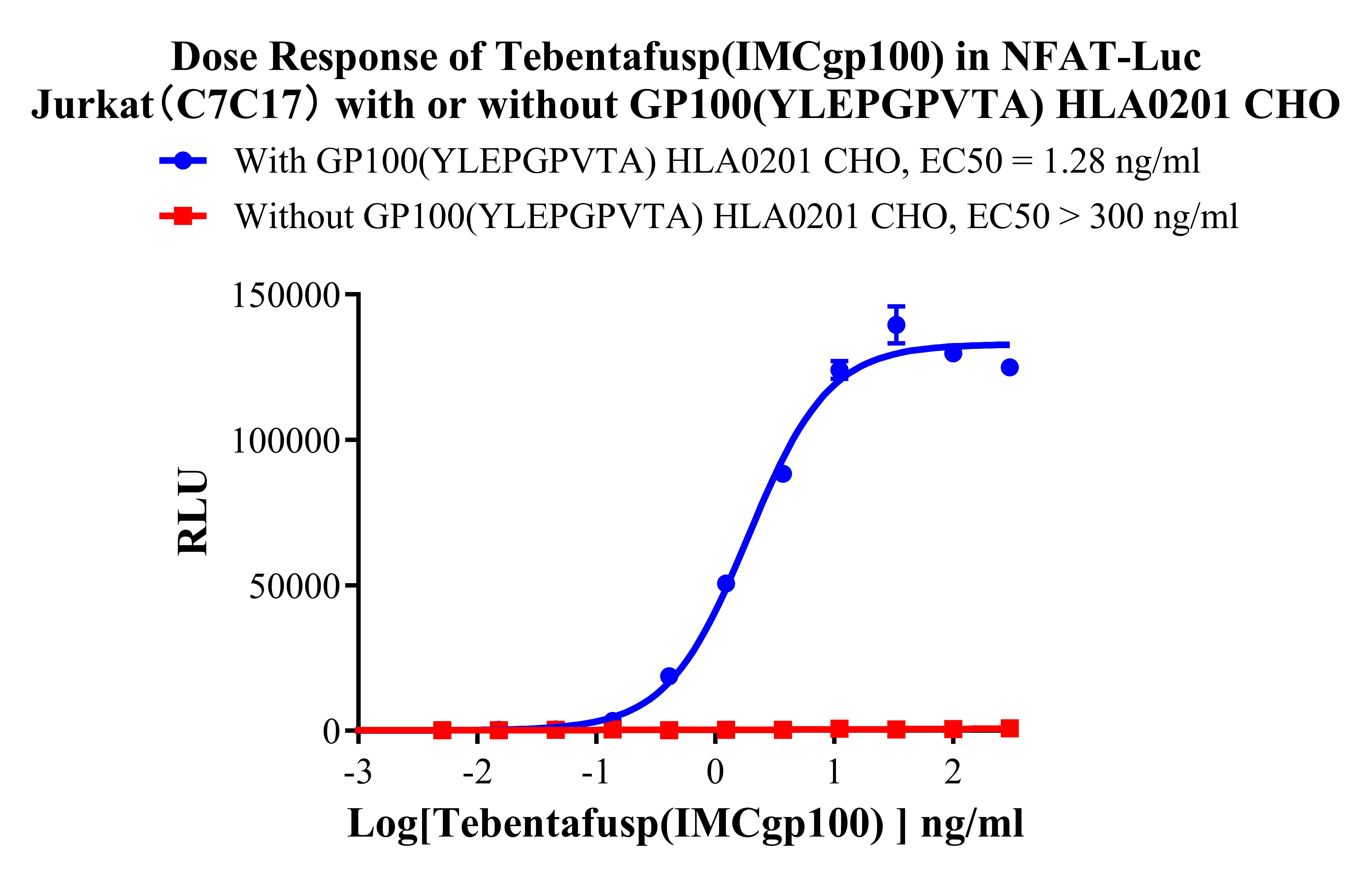 Figure 2. Dose Response of Tebentafusp (IMCgp100) in NFAT-Luc Jurkat(C7C17) with or without GP100(YLEPGPVTA) HLA0201 CHO. |