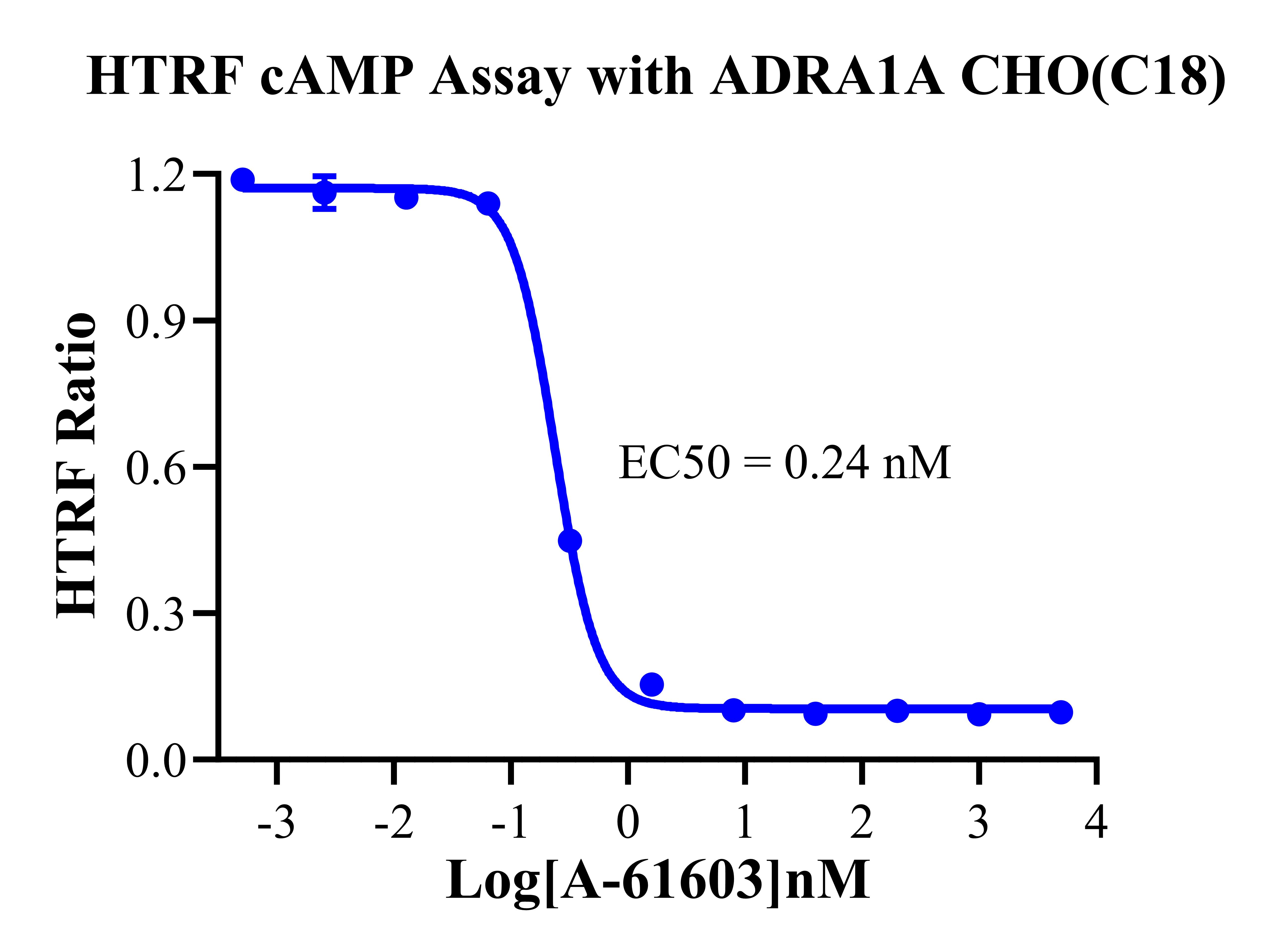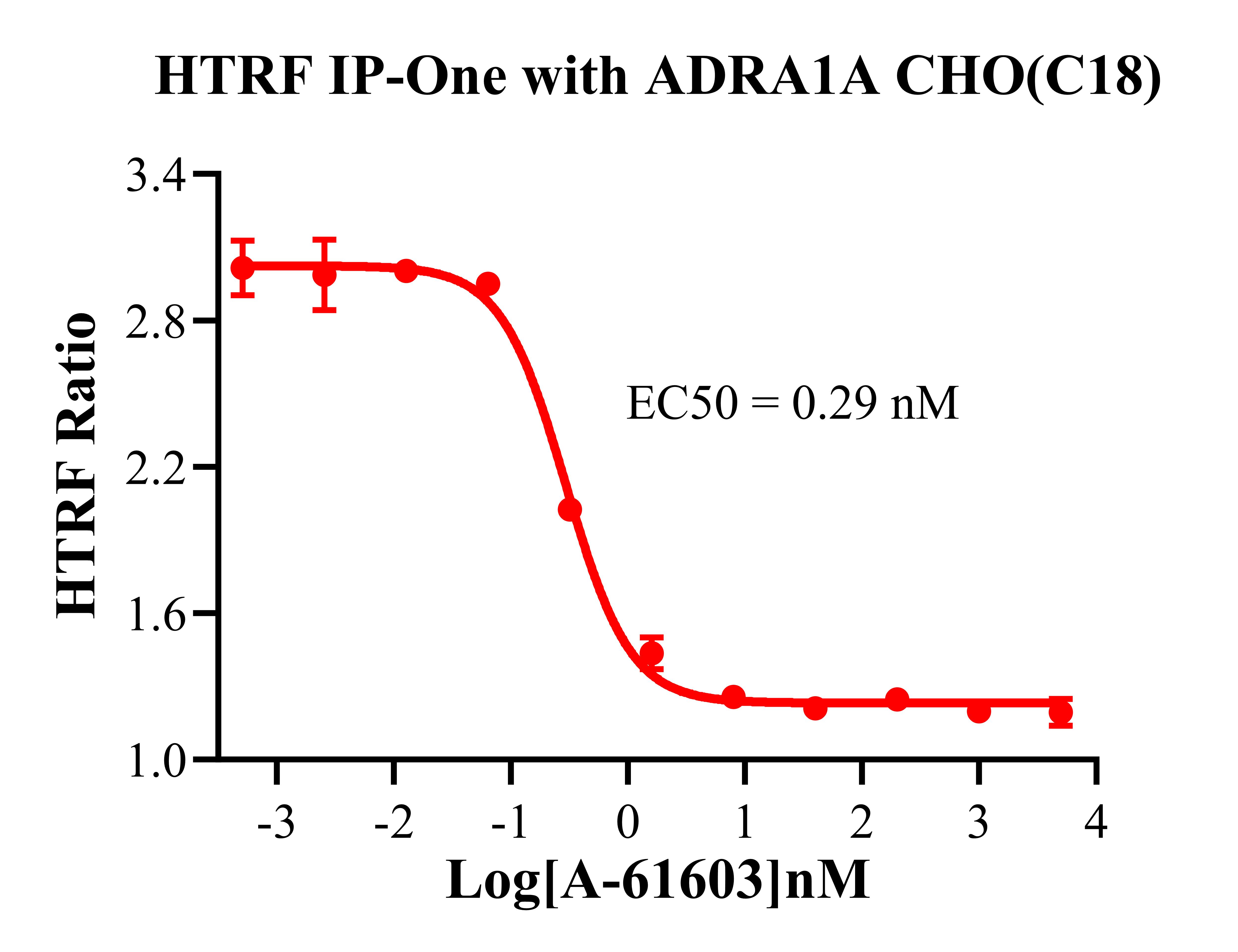 ADRA1A 還可以通過 Gq 蛋白的信號通路,調(diào)控 IP1 的升高。ADRA1A 與配體結(jié)合, 導(dǎo)致 Gαq 亞基的激活,觸發(fā) PLC-γ,從而產(chǎn)生兩個第二信使:IP3 和 DAG,它們參與細胞內(nèi)鈣動員。由于 IP3 在代謝上不穩(wěn)定,因此測量通路激活的替代標志物 IP1 作為檢測標準。