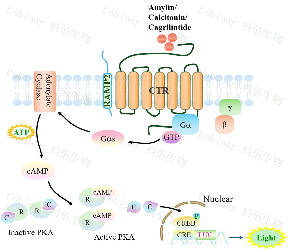 CTR&RAMP2 CRE-Luc CHO 報(bào)告基因藥靶模型很好的模擬了體內(nèi) CTR&RAMP2 的信號(hào)轉(zhuǎn)導(dǎo)過程,原理見下圖所示。