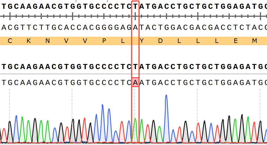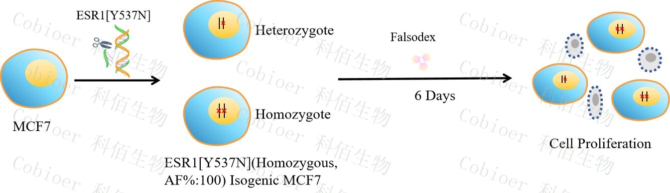 ESR1[Y537N](Homozygous,AF%:100) Isogenic MCF7 藥靶細(xì)胞,通過基 因編輯的方式將 ESR1 的 537 位氨基酸酪氨酸(Y)突變?yōu)樘於0罚∟)。![]() Figure 1. ESR1[Y537N](Homozygous,AF%:100) Isogenic MCF7 原理示意圖 |