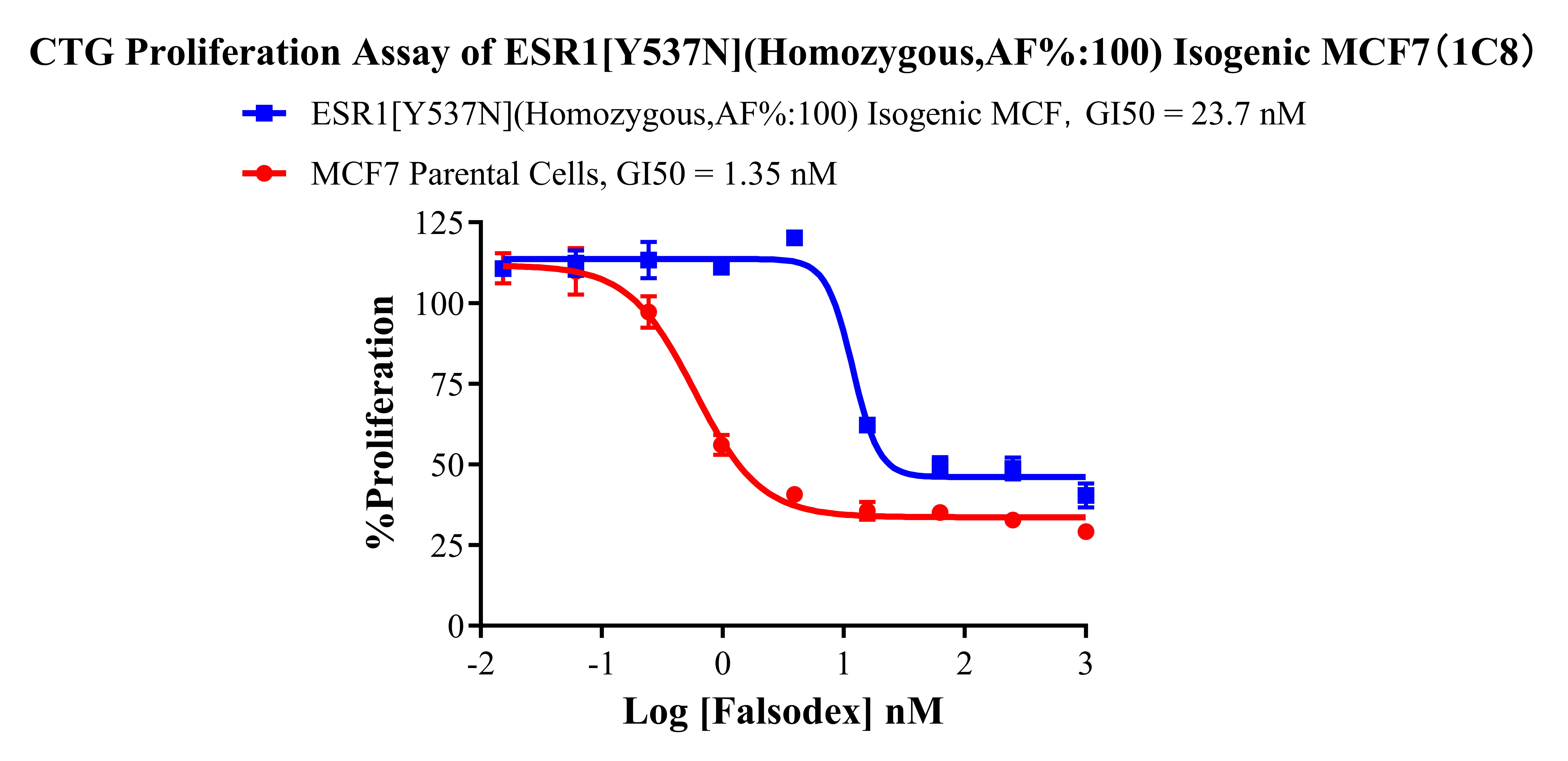 ![]() Figure 2. Sanger of ESR1[Y537N](Homozygous,AF%:100) Isogenic MCF7. ![]() Figure 3. A:MCF7 Parental Cell;B:ESR1[Y537N](Homozygous,AF%:100) Isogenic MCF7 通道2 藍(lán)色微滴代表ESR1[Y537N]突變陽(yáng)性,通道2 綠色微滴代表該位點(diǎn)為陰性野生型 ![]() Figure 4. CTG Proliferation Assay of ESR1[Y537N(Homozygous,AF%:100) Isogenie MCF7(1C8). |