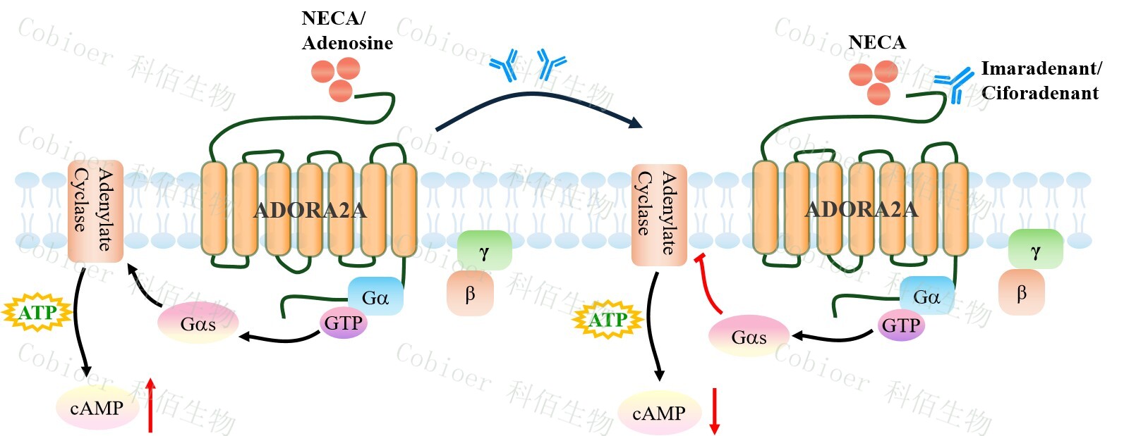 cAMP 在 G 蛋白偶聯(lián)受體(GPCR)信號轉導中是一種關鍵的第二信使。當配體結合 到 GPCR,構象發(fā)生變化,激活受體接著激活 G 蛋白,Gs 的激活導致腺苷酸環(huán)化酶調控 cAMP 的升高。