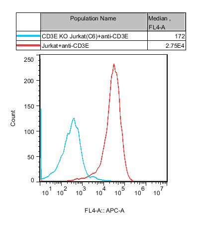 ![]() Figure 1. CD3E KO Jurkat 細(xì)胞測(cè)序驗(yàn)證結(jié)果[CD3E(NM_000733.4):c.133_134insGGCT/CD3E:p.V45Gfs*13] ![]() Figure 2. CD3E KO Jurkat 細(xì)胞,在 Jurkat 細(xì)胞上敲除 CD3E。