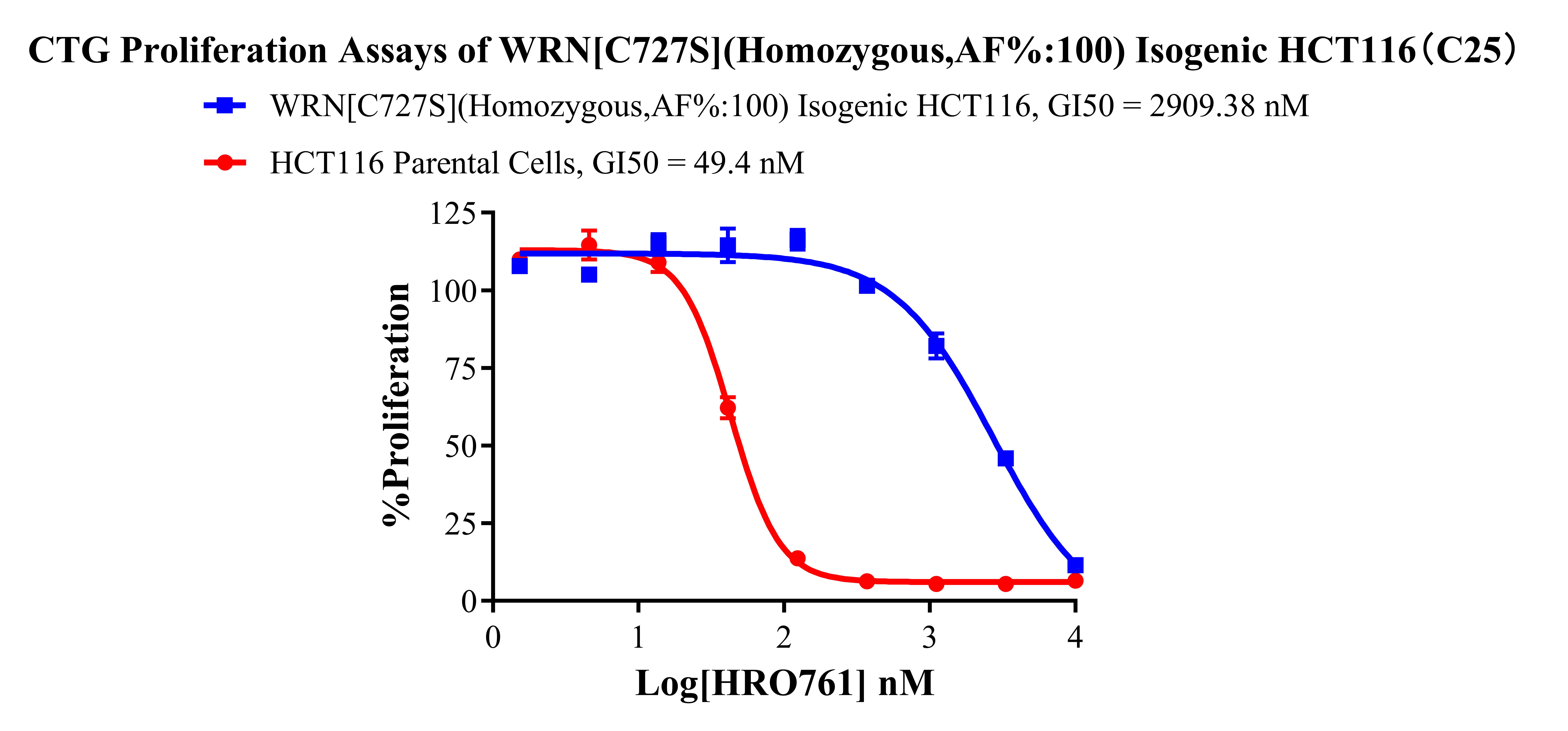 ![]() Figure 2. Sanger of WRN[C727S](Homozygous,AF%:100) Isogenic HCT116 ![]() Figure 3. A:HCT116 Parental Cell;B:WRN[C727S](Homozygous,AF%:100) Isogenic HCT116 通道2 藍(lán)色微滴代表WRN[C727S]突變陽性,通道2 綠色微滴代表該位點為陰性野生型 ![]() Figure 4. CTG Proliferation Assays of WRN[C727S](Homozygous,AF%:100)Isogenic HCT116(C25). ![]() Figure 5. CTG Proliferation Assays of WRN[C727S](Homozygous,AF%:100) Isogenic HCT116(C25). |