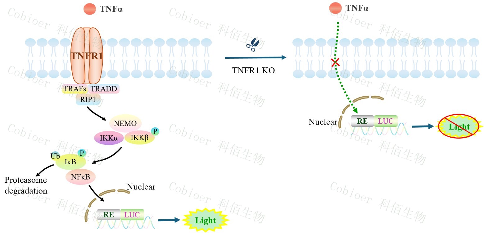 TNFR1 KO NFκB-Luc Jurkat 報(bào)告基因藥靶模型很好的模擬了體內(nèi) NFκB 的信號轉(zhuǎn)導(dǎo)過程,原理見下圖所示。![]() Figure 1. TNFR1 KO NFκB-Luc Jurkat 細(xì)胞模型原理圖 |