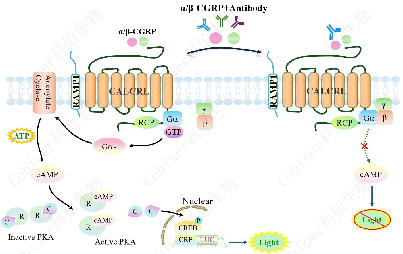 | 降鈣素基因相關肽(CGRP)家族包括 CGRP 本身、降鈣素(CT)、腎上腺髓質素(AM)和 胰島淀粉樣肽(AMY)。 神經(jīng)肽降鈣素基因相關肽(CGRP)是中樞和外周神經(jīng)元產(chǎn)生的一種有效的血管擴張劑。 CGRP 在人體內(nèi)以α - CGRP 和β - CGRP 兩種形式存在。α - CGRP 和β - CGRP 都是受體的完 全激動劑。CGRP 通過 CGRP 受體介導其作用,CGRP 受體是一種異二聚體復合物:G 蛋 白偶聯(lián)受體 CALCRL 和單跨膜結構域蛋白受體 RAMP1。功能 CGRP 受體所需的最后一個 成分是受體成分蛋白(RCP)。缺乏 RCP 已被證明會影響 CGRP 受體的激活,以環(huán)磷酸腺苷 (cAMP)的增加來衡量,而不影響配體的結合。受體的主要功能單元 CALCRL(也稱為 CLR 或 CRLR)可以連接到三種 RAMPs 中的一種,這三種 RAMPs 分別產(chǎn)生不同的受體。 RAMPs 是單跨膜蛋白,對受體功能至關重要,因為它們參與受體復合物向質膜的易位,并 進一步提供配體結合的特異性。CALCRL 與 RAMP1 組成 CGRP 受體;RAMP2 是 AM 受 體,命名為 AM1;RAMP3 是 CGRP/AM 雙受體,命名為 AM2。RAMP1 亞基負責 CGRP 與 CGRP 受體的特異性結合。 配體結合后,復合物與 G 蛋白相互作用,Gαs 亞基從復合物中分離并激活腺苷酸環(huán)化 酶,產(chǎn)生 cAMP。細胞內(nèi) cAMP 濃度升高刺激 cAMP 依賴的信號通路,最終導致轉錄因子 cAMP 應答元件結合蛋白(CREB)與 CRE 啟動子結合,誘導基因表達。 |