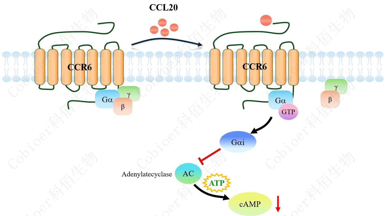cAMP 在 G 蛋白偶聯(lián)受體(GPCR)信號轉(zhuǎn)導(dǎo)中是一種關(guān)鍵的第二信使。當(dāng)配體結(jié)合到 GPCR,構(gòu)象發(fā)生變化,激活受體接著激活 G 蛋白,Gi 的激活導(dǎo)致腺苷酸環(huán)化酶調(diào)控 cAMP 的下調(diào)。CCR6 藥靶模型很好的模擬了體內(nèi) CCR6 的信號轉(zhuǎn)導(dǎo)過程,原理見下圖所示。![]() Figure 1. CCR6 CHO 細胞模型原理圖 |