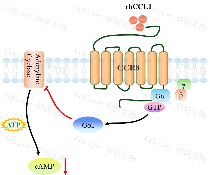 cAMP 在 G 蛋白偶聯(lián)受體(GPCR)信號轉(zhuǎn)導(dǎo)中是一種關(guān)鍵的第二信使。當(dāng)配體結(jié)合到 GPCR,構(gòu)象發(fā)生變化,激活受體接著激活 G 蛋白,Gi 的激活導(dǎo)致腺苷酸環(huán)化酶調(diào)控 cAMP 的下調(diào)。CCR8 藥靶模型很好的模擬了體內(nèi) CCR8 的信號轉(zhuǎn)導(dǎo)過程,原理見下圖所示。