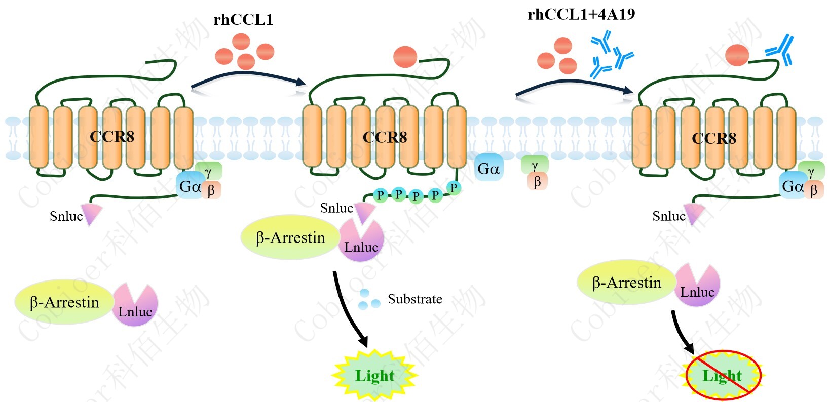 CCR8 β-Arrestin CHO 報(bào)告基因藥靶模型很好的模擬了體內(nèi) CCR8/β-Arrestin 的信號(hào)轉(zhuǎn)導(dǎo)過(guò)程,原理見(jiàn)下圖所示。當(dāng)缺乏配體刺激時(shí),β-Arrestin 不與 CCR8 結(jié)合,融合β-Arrestin的熒光素酶處于失活構(gòu)象,當(dāng) CCR8 遭遇配體刺激時(shí),融合熒光素酶報(bào)告基因的β-Arrestin被招募,使熒光素酶報(bào)告基因處于激活狀態(tài),加入其底物后發(fā)光信號(hào)增強(qiáng)。