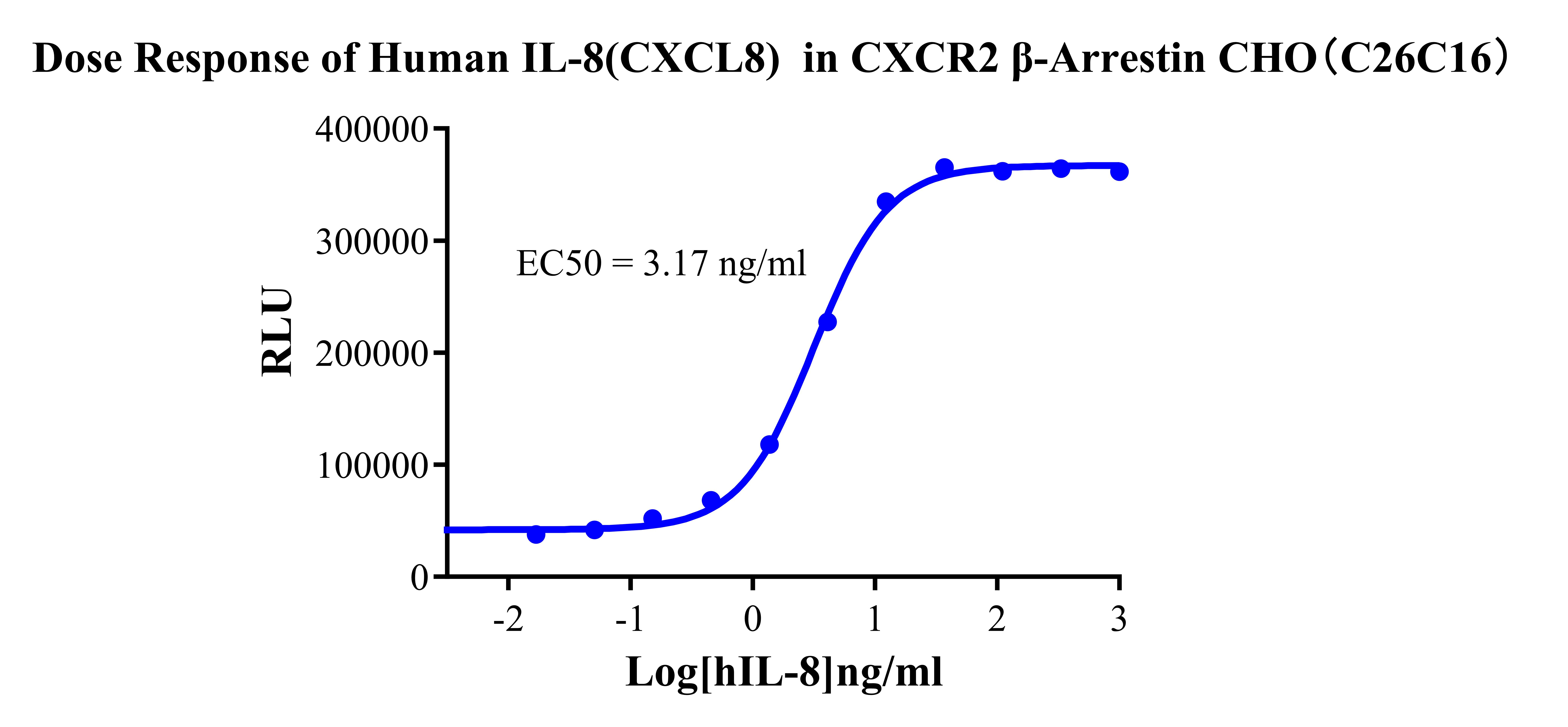 Figure 3.Dose response of Human IL-8(CXCL8) in CXCR2 β-Arrestin CHO (C26C16). |