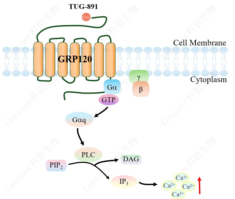GPR120 與配體結(jié)合,導(dǎo)致 Gαq 亞基的激活,觸發(fā) PLC-γ,從而產(chǎn)生兩個(gè)第二信使: IP3 和 DAG,它們參與細(xì)胞內(nèi)鈣動(dòng)員。GPR120 CHO 細(xì)胞藥靶模型很好的模擬了體內(nèi) GPR120 的信號(hào)轉(zhuǎn)導(dǎo)過(guò)程,原理見(jiàn)下圖所示。![]() Figure 1. GPR120 CHO 細(xì)胞模型原理圖 |