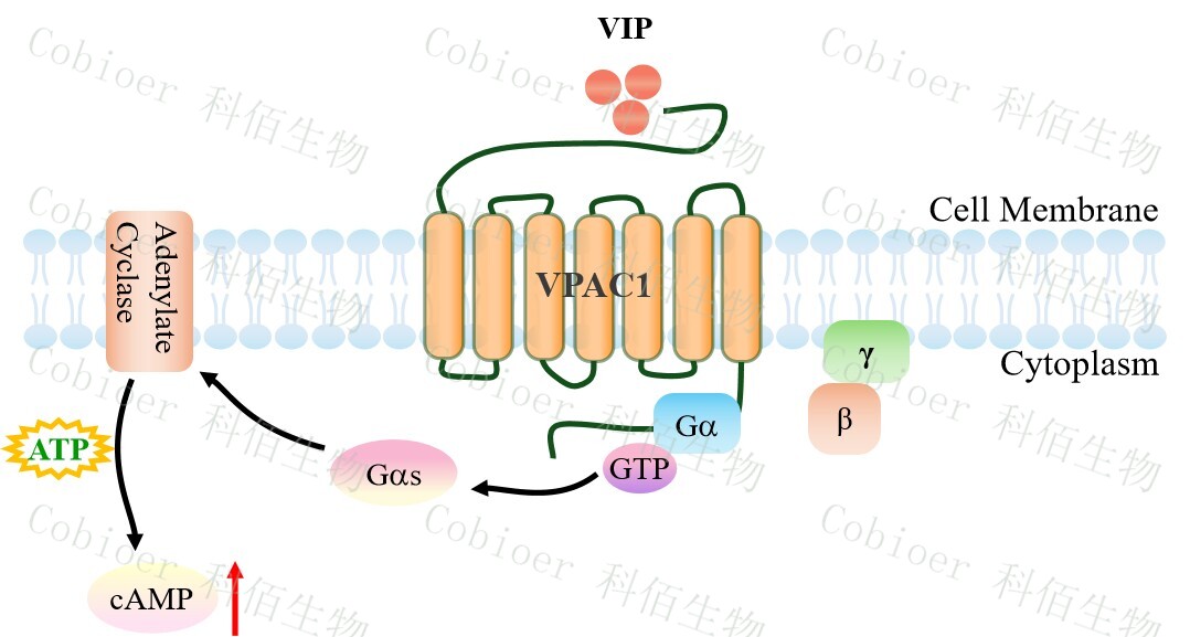 | PACAP/VIP 受體家族屬于 B 類 G 蛋白偶聯(lián)受體(GPCR),包含 PAC1R (PAC1)、 VPAC1R (VPAC1) 和 VPAC2R (VPAC2) 三個亞型,共同響應(yīng)神經(jīng)肽 PACAP(垂體腺苷酸 環(huán)化酶激活肽)和 VIP(血管活性腸肽)的調(diào)控,通過激活 Gs/cAMP-PKA 核心信號軸 (部分亞型偶聯(lián) Gq/PLC)廣泛協(xié)調(diào)神經(jīng)內(nèi)分泌、代謝穩(wěn)態(tài)與免疫調(diào)節(jié)。 VPAC1 受體(血管活性腸肽受體 1 型) 作為 B 類 GPCR 家族的核心成員,主要在免 疫細胞、胃腸道及呼吸道高表達,以內(nèi)源性配體血管活性腸肽(VIP) 和垂體腺苷酸環(huán)化 酶激活肽(PACAP) 為高親和力激活源,通過專一性偶聯(lián) Gs/cAMP-PKA 信號軸發(fā)揮關(guān)鍵 生理調(diào)控作用。VPAC1 的激活可抑制巨噬細胞炎癥因子釋放(如 TNF-α、IL-12)、促進腸 道平滑肌舒張與上皮屏障修復(fù)、擴張支氣管并抑制黏液分泌,從而維持免疫耐受、胃腸動 力及呼吸穩(wěn)態(tài)。VPAC1 功能缺陷已被證實與炎癥性腸?。↖BD)、哮喘和類風(fēng)濕關(guān)節(jié)炎的 病理進程密切相關(guān),而靶向激動劑在急性呼吸窘迫綜合征(ARDS)與 IBD 治療中已展現(xiàn) 顯著療效,凸顯其作為免疫-黏膜穩(wěn)態(tài)核心調(diào)節(jié)器的治療價值。 |