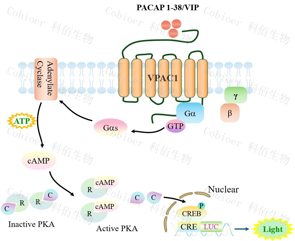 VPAC1 CRE-Luc HEK293 報(bào)告基因藥靶模型很好的模擬了體內(nèi) VPAC1 的信號(hào)轉(zhuǎn)導(dǎo)過程,原理見下圖所示。![]() Figure 1. VPAC1 CRE-Luc HEK293 細(xì)胞模型原理圖 |